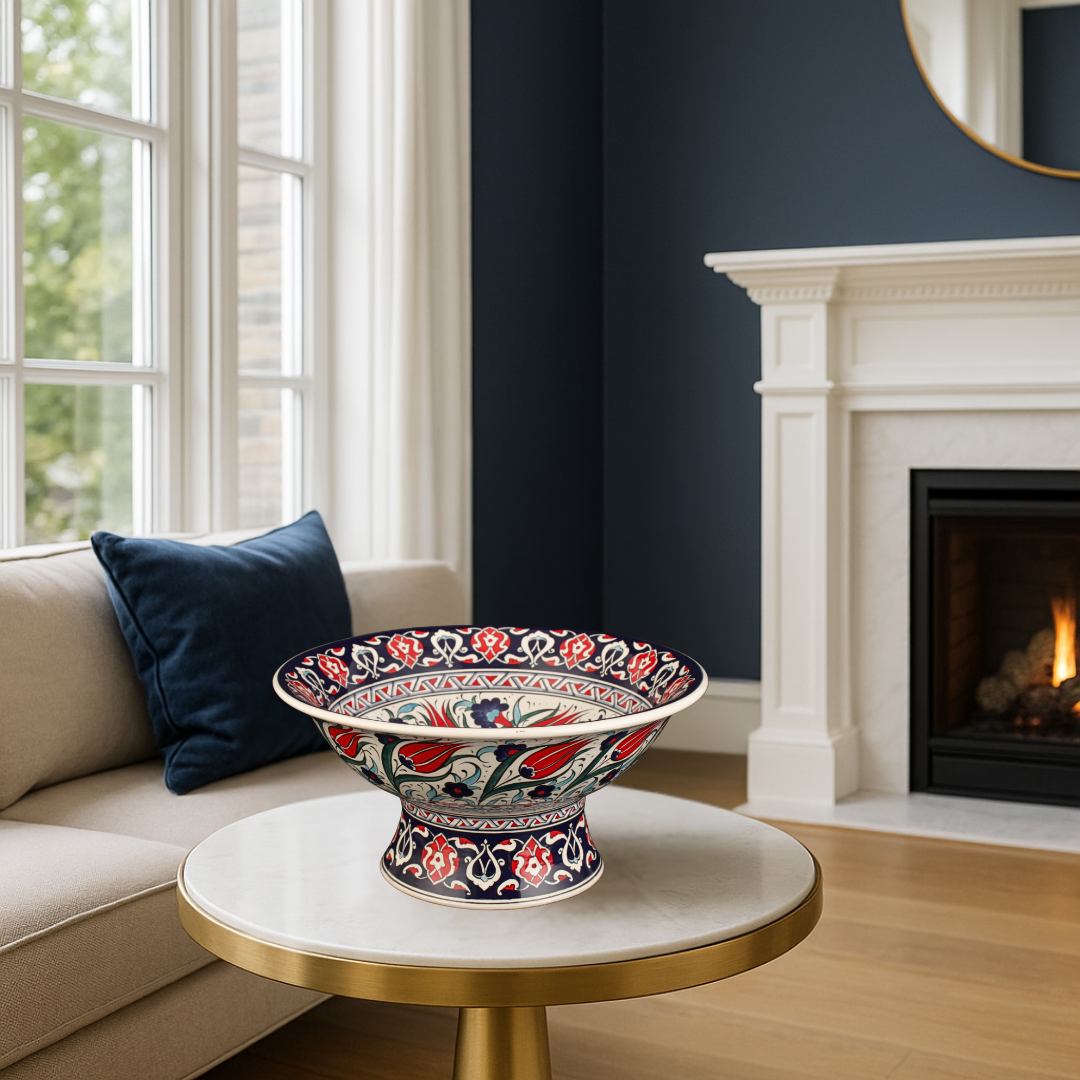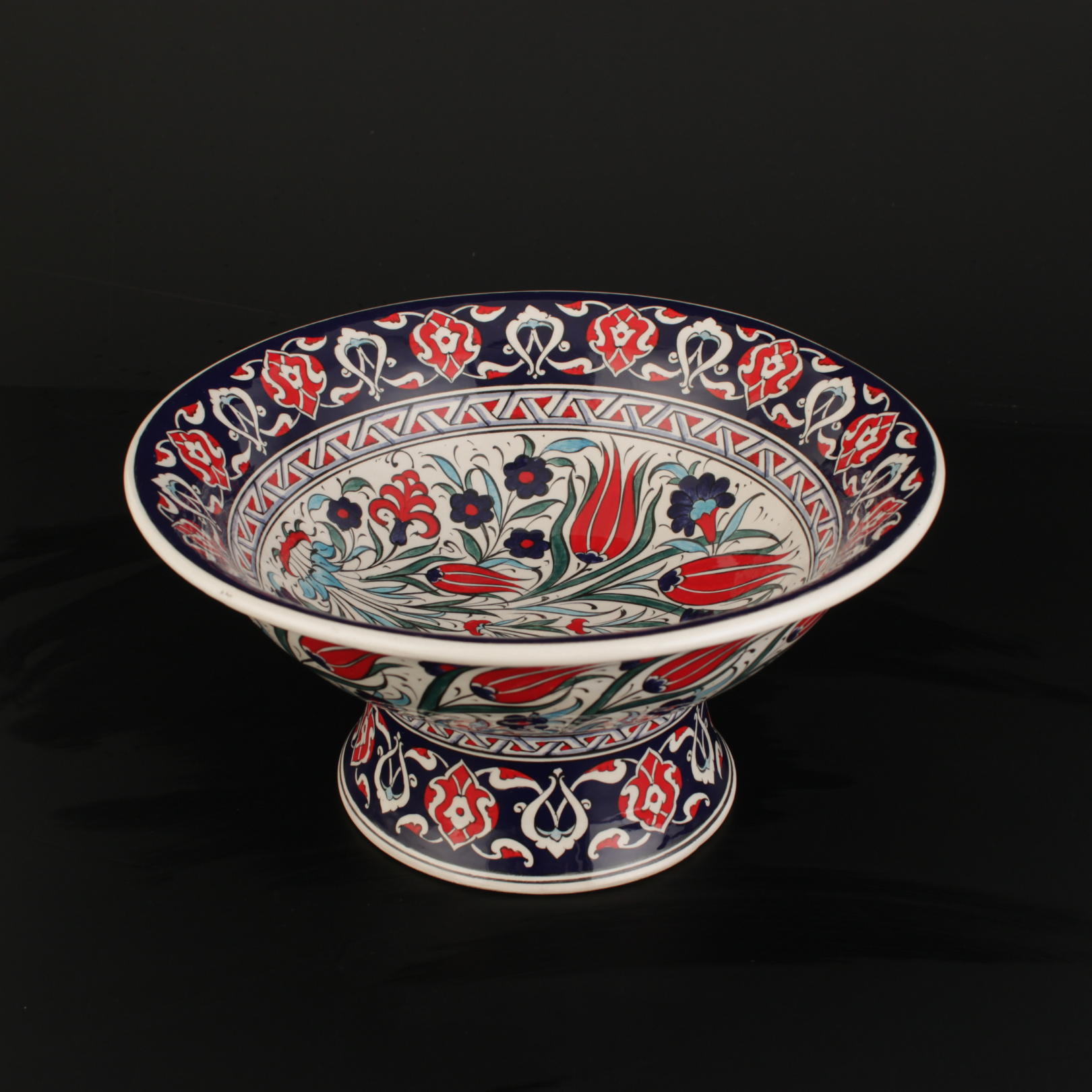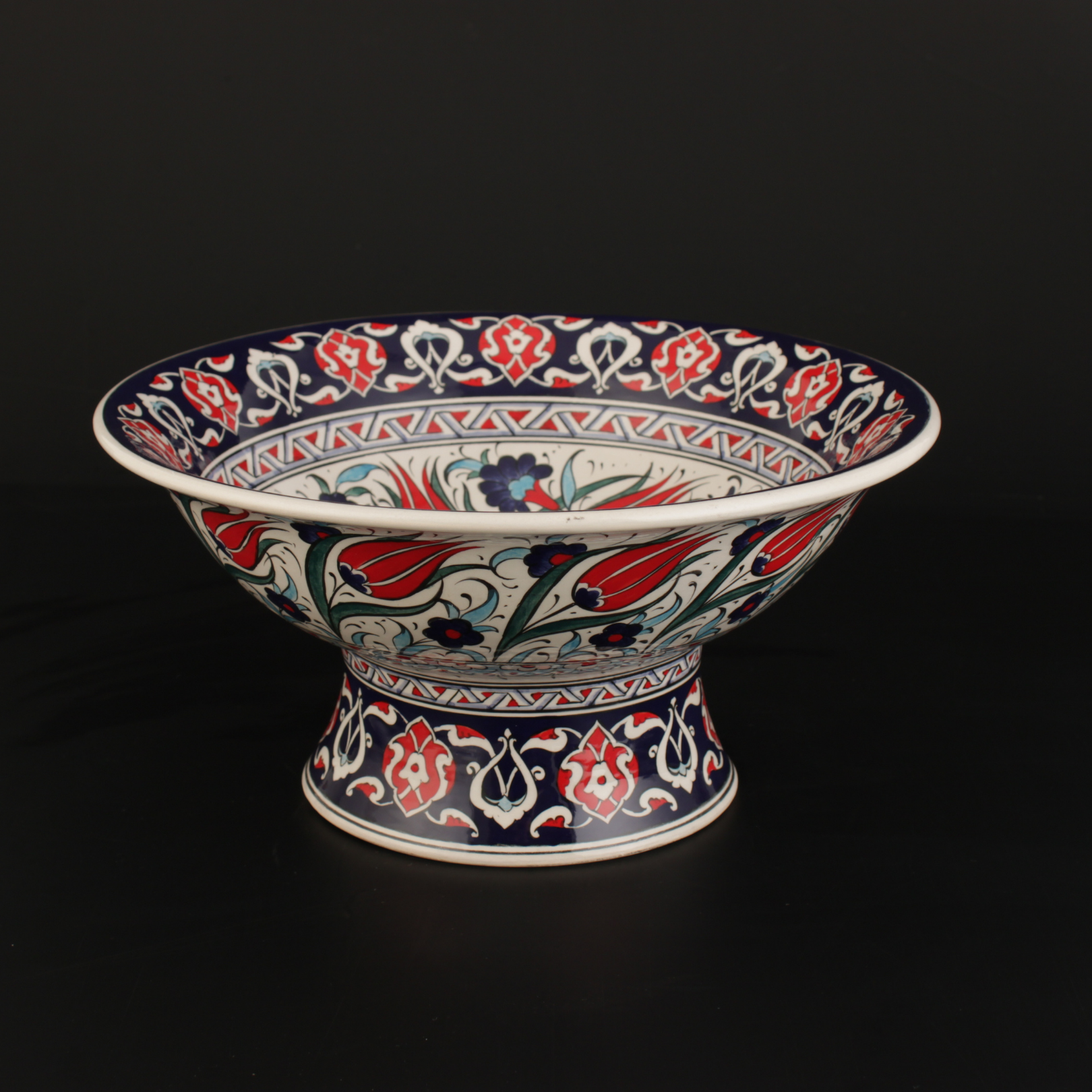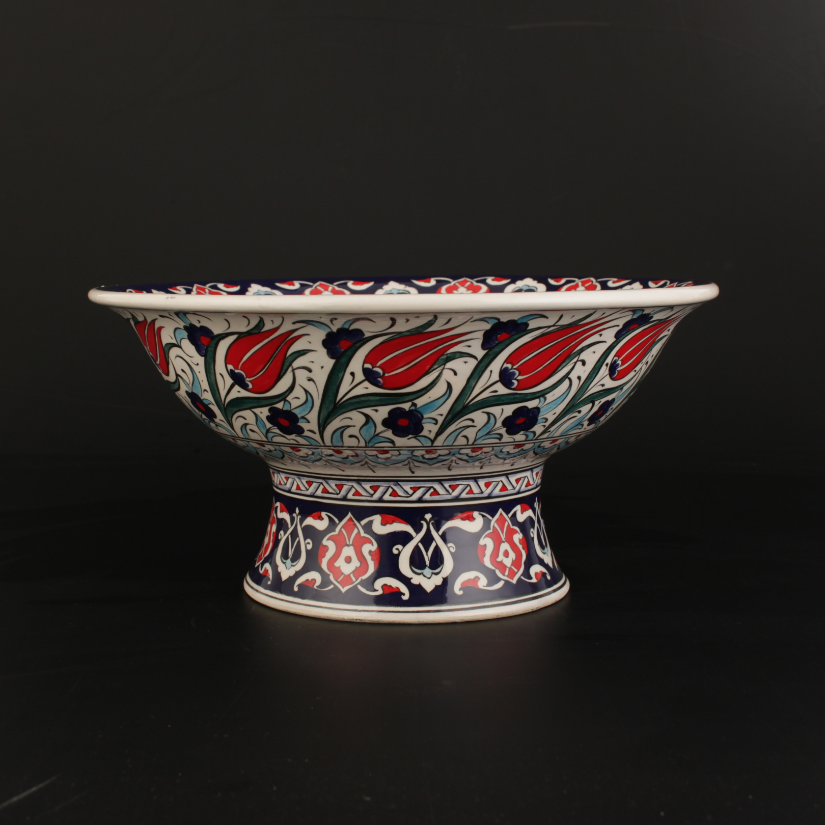 El yapımı çini kase; Topkapı sarayında bulunan lale motifleri modern bir yüzey kurgusuyla buluşturan seçkin parça.
