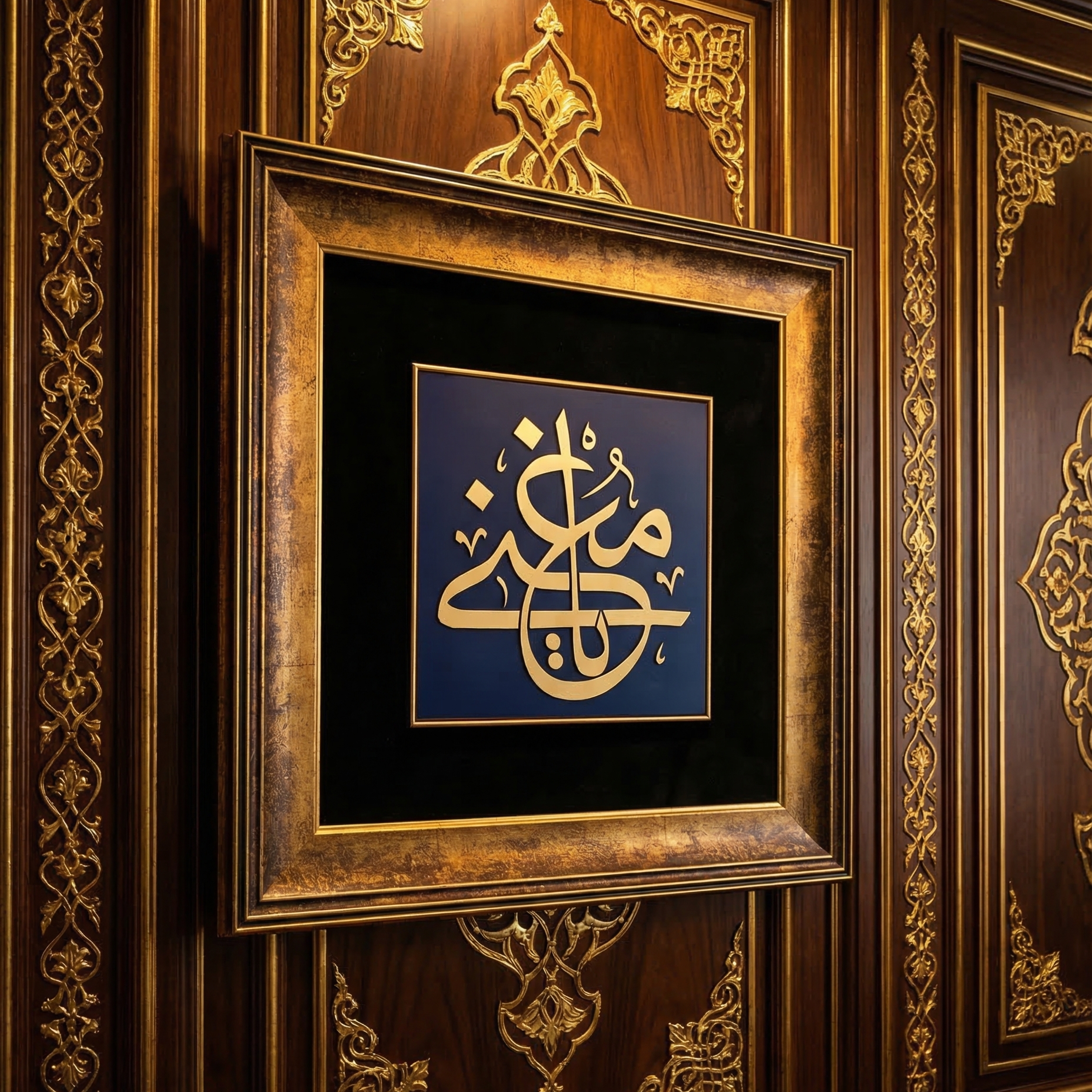 Kompozisyonun merkezinde yer alan Ya Muğnî hat yazısı, klasik hat sanatının dengeli formu ile tasarlanarak güçlü bir görsel odak oluşturur. Lacivert tonlu zemin üzerinde yer alan zarif yazı formu, altın tonlu çerçeve ve kadife fon ile birleşerek esere klasik ve ihtişamlı bir görünüm kazandırır.