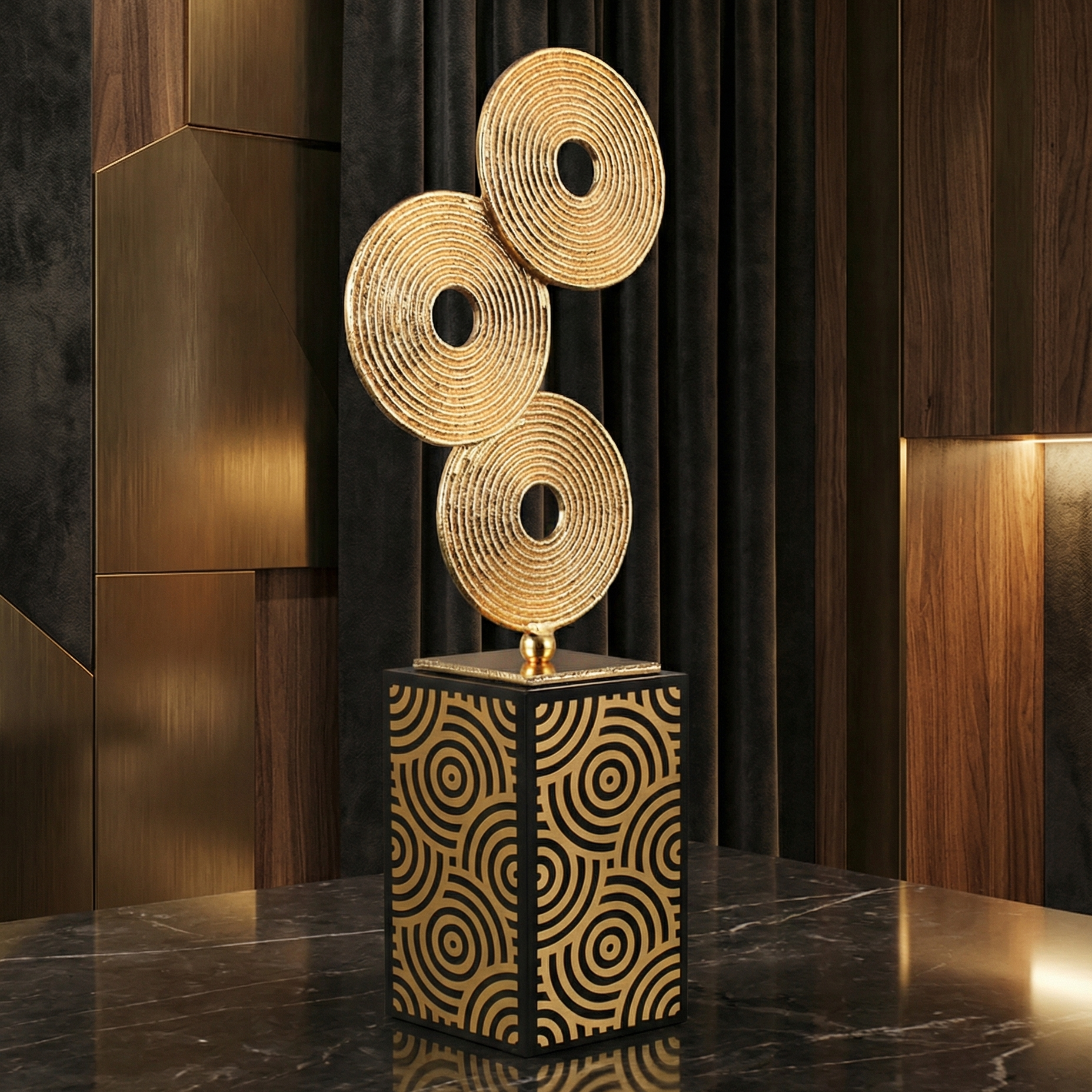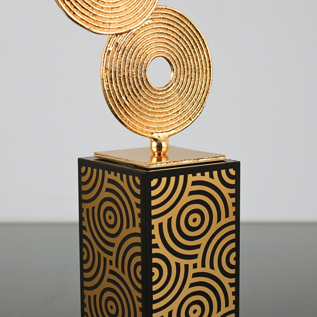 Zaman Halkaları Masa Objesi , dairesel katmanların ritmini modern bir ofis diliyle bir araya getirir. Altın tonlu metal halkalar, ışığı yakaladıkça yüzeyde sakin bir hareket hissi oluşturur; geometrik desenli cam kaide ise bu hareketi “dengeli ve rafine” bir zemine oturtur. Parçalar elde monte edilir ve yüzey bitişleri titizlikle uygulanır.