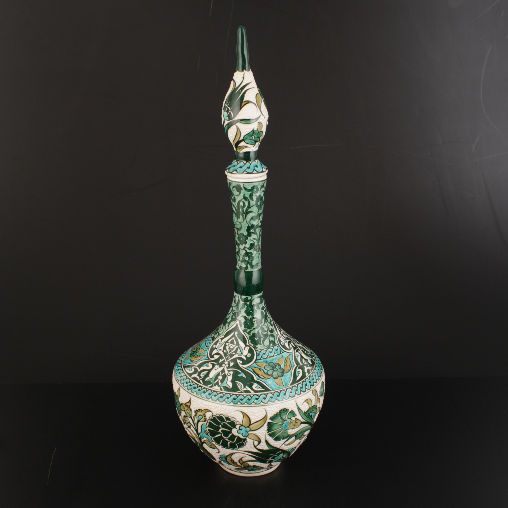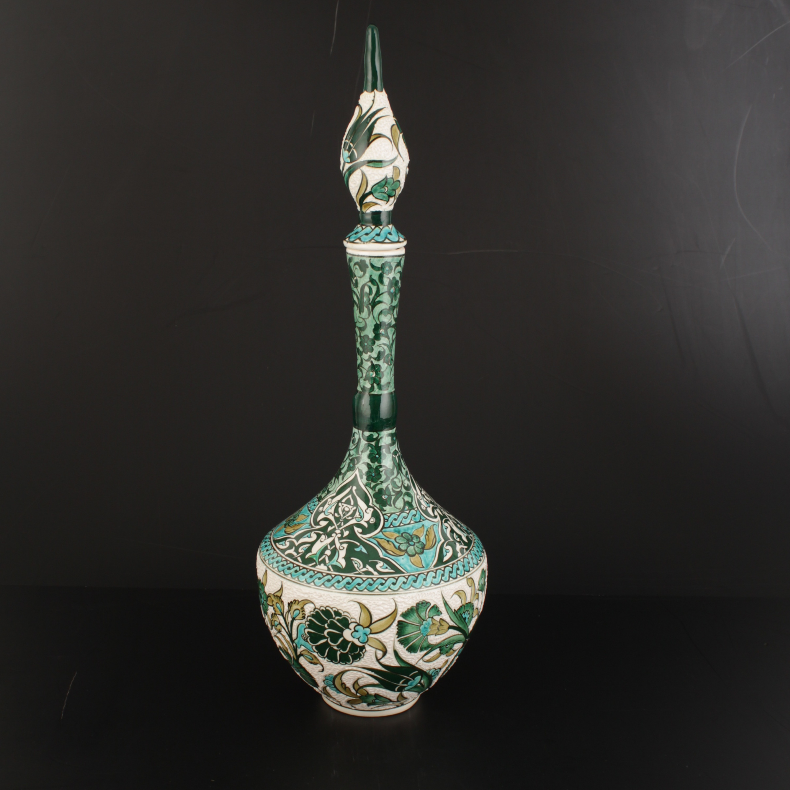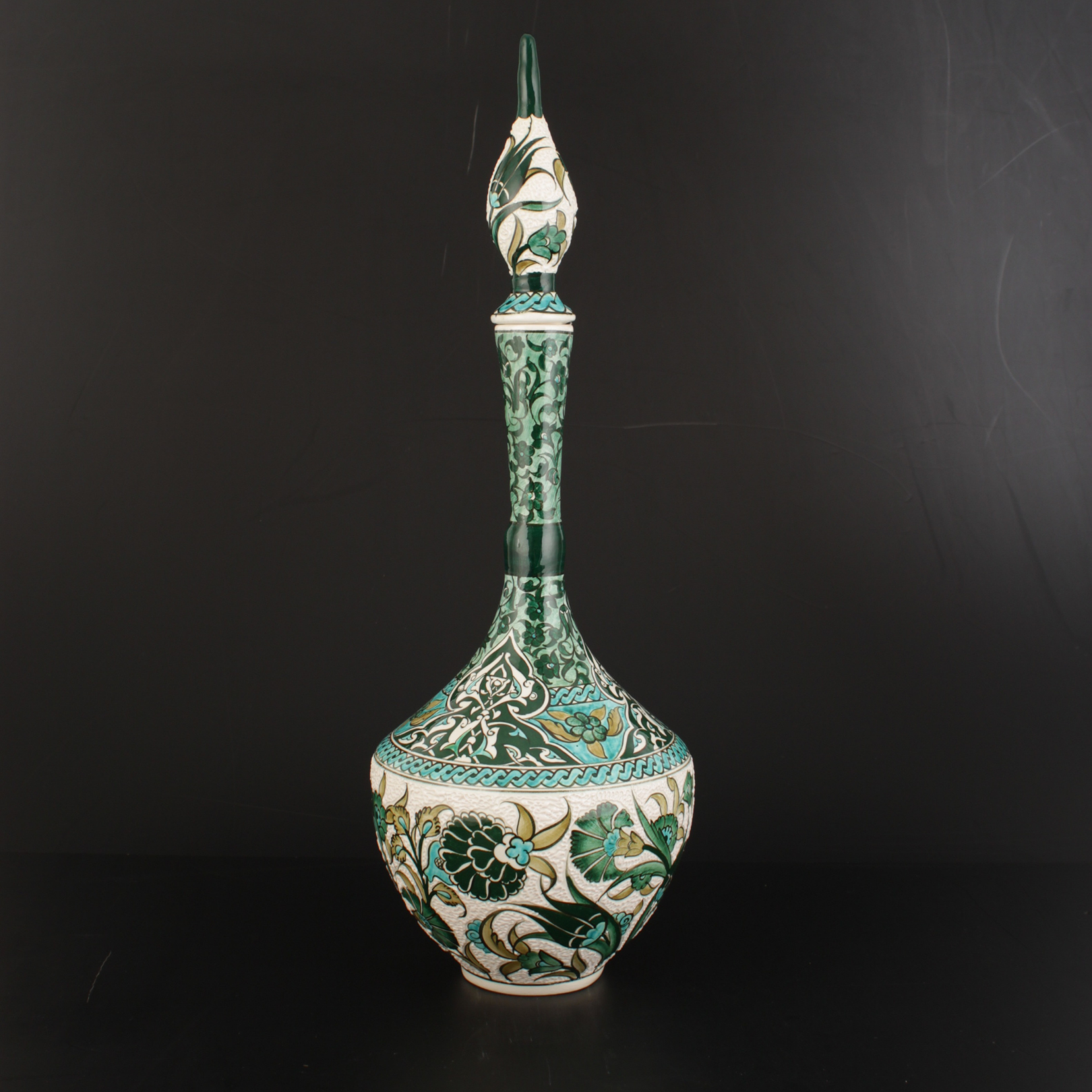 Zümrüt Saz Vazo, klasik “saz yolu” üslubunun akıcı yapraklarını zarif lâle vurgularıyla buluşturan el yapımı bir çini vazodur. Geniş gövde ve zarif boyun oranı, zümrüt tonların derinliğiyle heykelsi bir siluet kurar; mekâna hem saray estetiği hem de çağdaş bir zarafet taşır. Her parça ustasının elinde tek tek şekillenir ve elde dekore edilir.